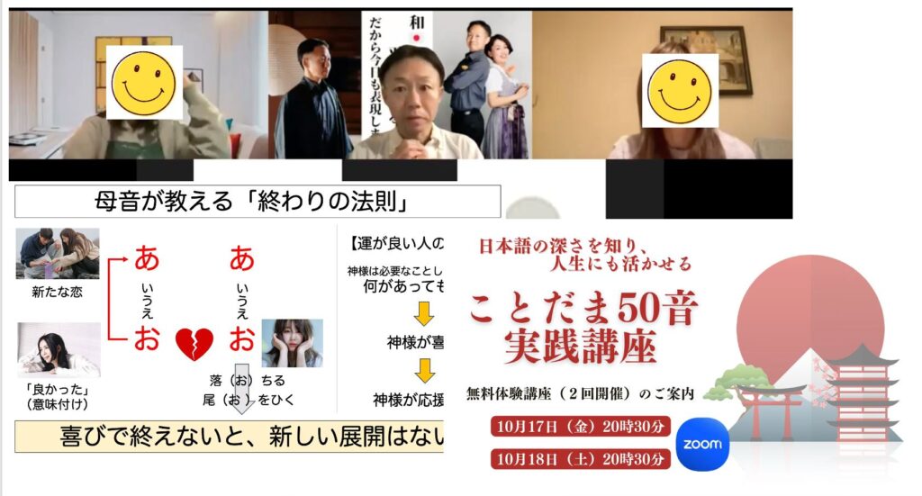 この「名前のことだま®︎」の根底にあるのが、日本語1音1音の意味、働きやことだま思想や日本の神話です。20代の頃、日本が大嫌い(それで海外逃亡)だった私が初めてこれらを学んだ時、直感ではありますが「これは世界を平和にする知恵だ!」という確信を得ました。今ではお名前の鑑定だけではなく、これらの内容の講座も国内・海外問わずやっております(令和8年秋からは、英語版もリリースします)。